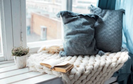 Parapet kamienny lub kompozytowy wyposażmy w tekstylne siedzisko i poduchy oraz pled. Będzie wówczas budził skojarzenia z miłym miejscem wypoczynku.